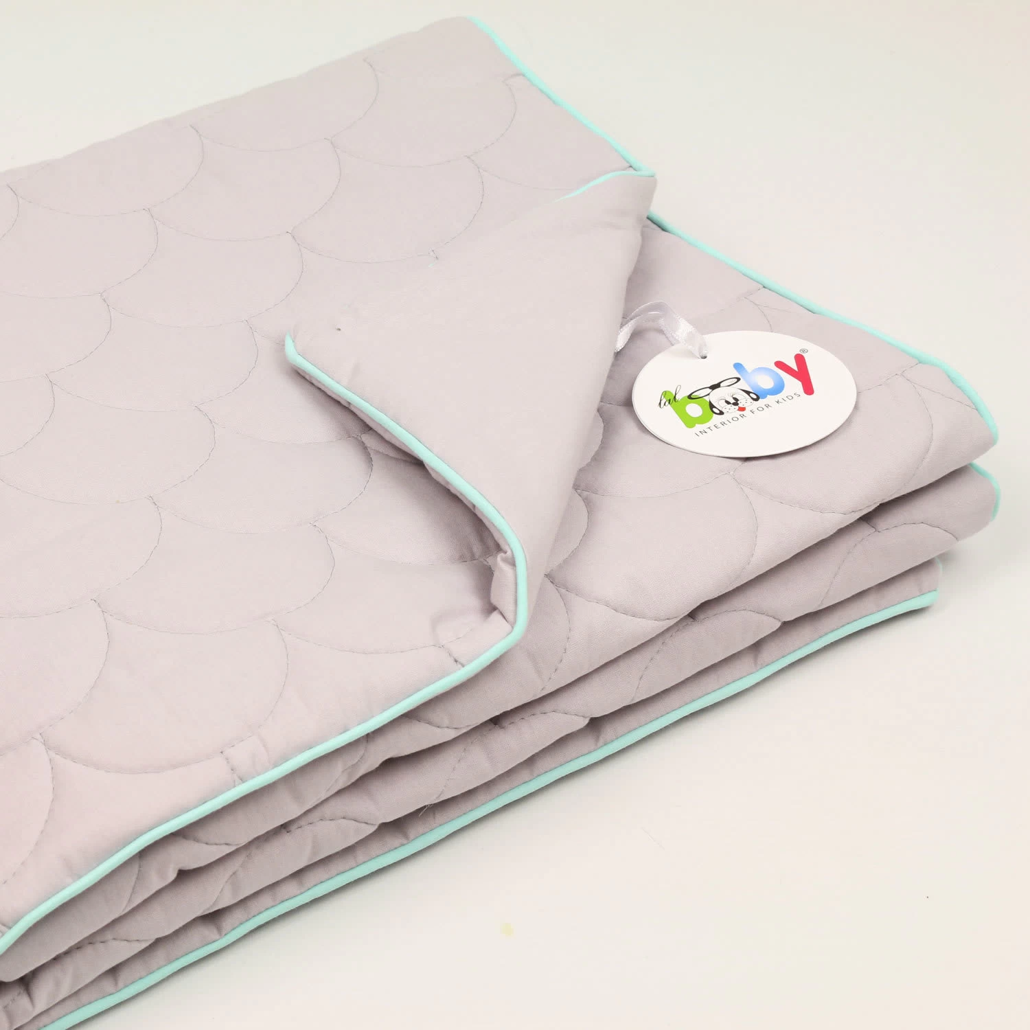 vorne: grau mit Meerjungfrau-Steppung und Paspelband in mint.